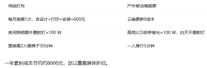 传统灯箱一旦落地便难以挪动,而快闪经济、流动档口讲究“今日东门、明日南街”。55寸户外移动海报屏天生带轮、即插即用,不到五分钟便能从仓库推到路口,广告位从此“想搬就搬”。