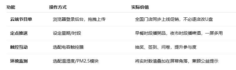 直面正午阳光依旧清晰;178°广视角,行人侧身路过也能捕获画面。高亮背后是定制直下式背光与光学均匀膜,消除户外常见的“曝光过度”与“暗角”。